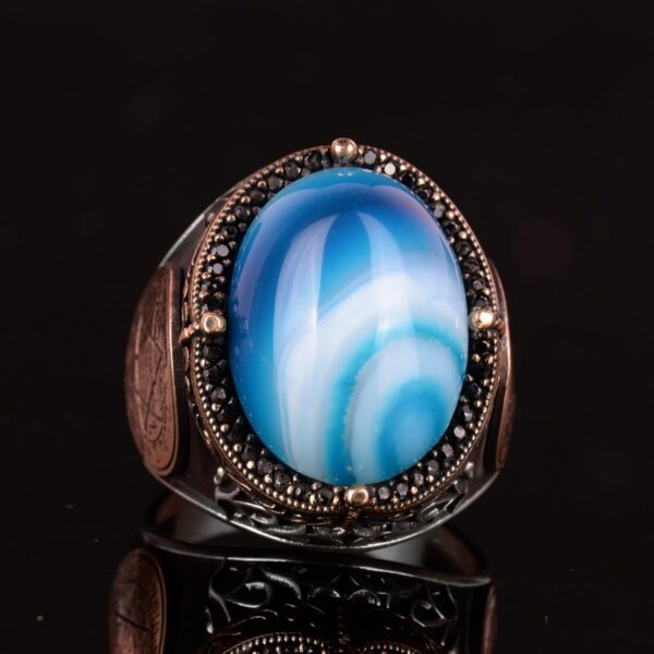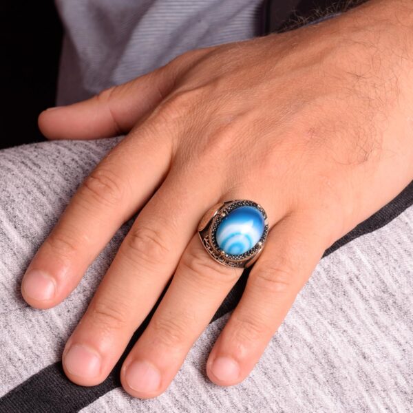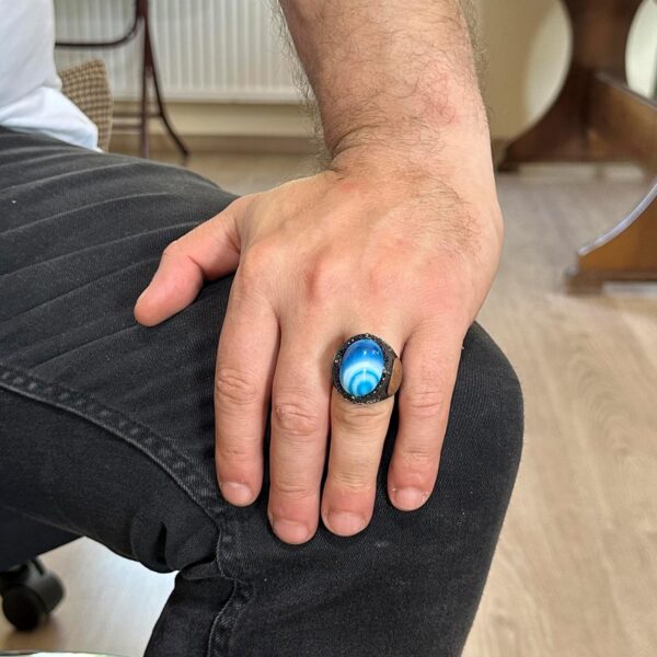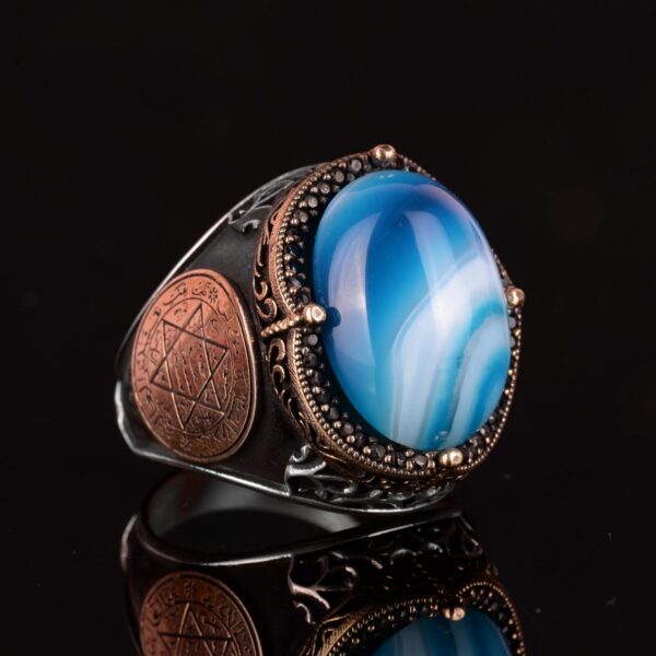 Doğal Mavi Akik Taşı Yüzük, Davud Yıldızı Yüzüğü – 925 Ayar Gümüş Erkek Yüzüğü, Gümüş Süleyman Mührü Yüzüğü