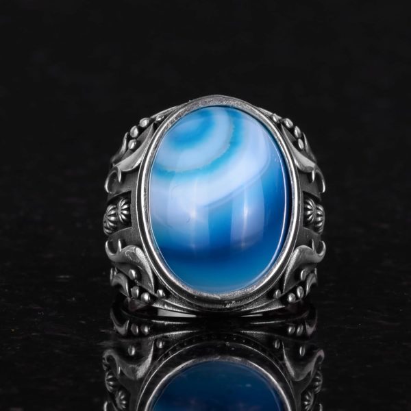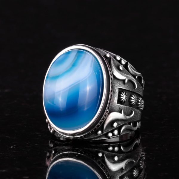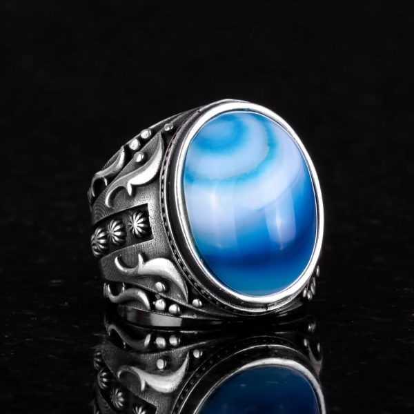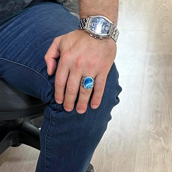 Doğal Mavi Ateş Kehribar Taşlı Yüzük, 925 Ayar Gümüş Yüzük Erkekler İçin, Tasarım Gümüş Erkek Yüzüğü