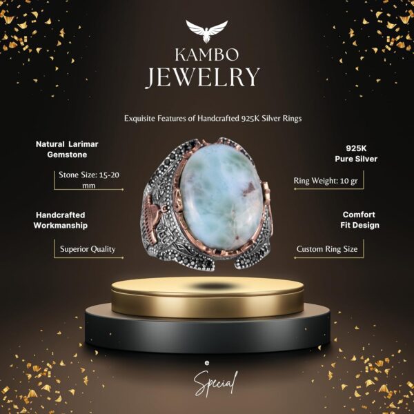 Doğal Müslüman Larimar Taşlı Yüzük, 925K Katı Gümüş Erkek Yüzüğü, Okyanus Sakinliği Tasarımı