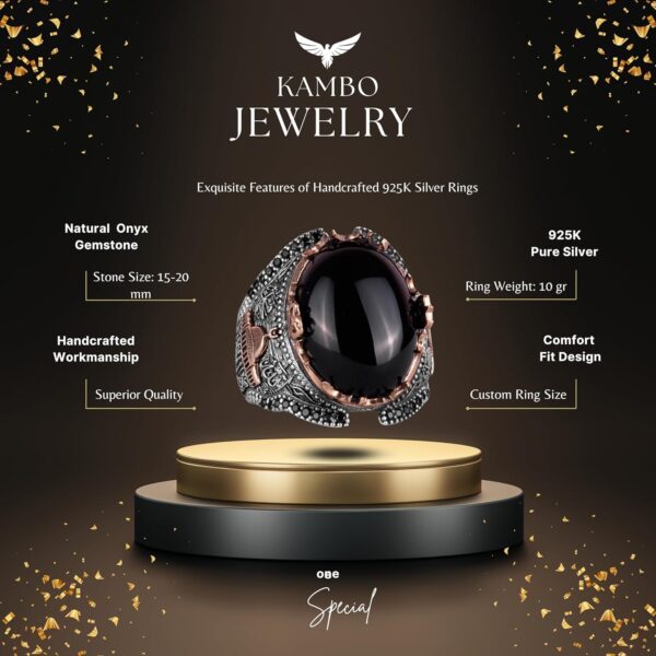 KAMBO Özel Koleksiyonu, 925K Katı Gümüş Erkek Yüzüklerimizin eşsiz zarafetini keşfetmeniz için sizi davet ediyor. Koleksiyonumuz, çeşitli doğal taşlarla zenginleştirilmiştir. Her bir doğal taş, kendine has güzelliği ve getirdiği benzersiz enerji ile seçilmiştir. El yapımı yüzüklerimiz, zarif işçiliğin bir göstergesi olup, lüksün ve kişisel ifadenin özünü yansıtmaktadır. KAMBO, yüzüğünüzü tam ölçü ve tercihinize göre özelleştirme seçeneği sunarak, sizi ince mücevher dünyasına yakın bir yolculuğa çıkarıyor. Doğa ve sanatın uyumunu, kalite, memnuniyet ve zamansız zarafet vaat eden, her biri olağanüstü doğal taşlarla süslenmiş yüzüklerimizle deneyimleyin. ONİKS İLE İÇSEL SULH BULUN: Oniks, duygusal dayanıklılığı ile ünlüdür. Bu derin siyah taş, içsel huzur ve denge bulmanıza yardımcı olabilir. Yüzük Ağırlığı: 10gr Taş Boyutu: 20-15mm