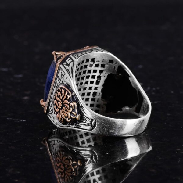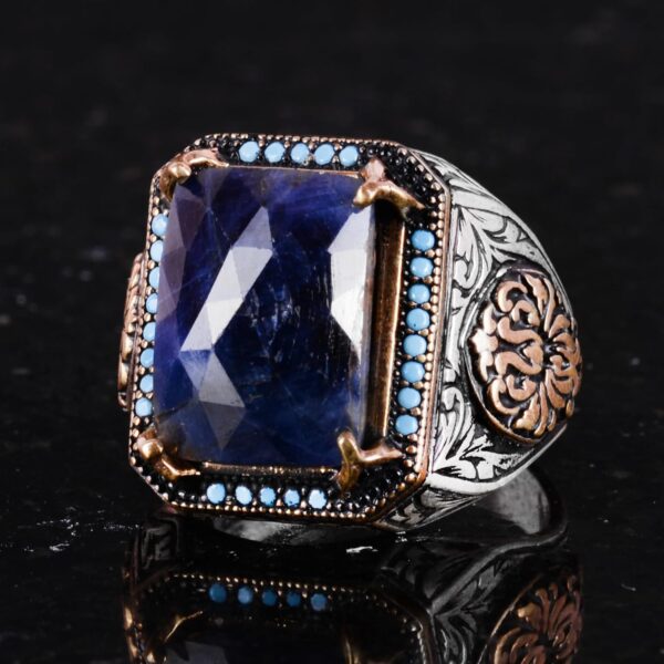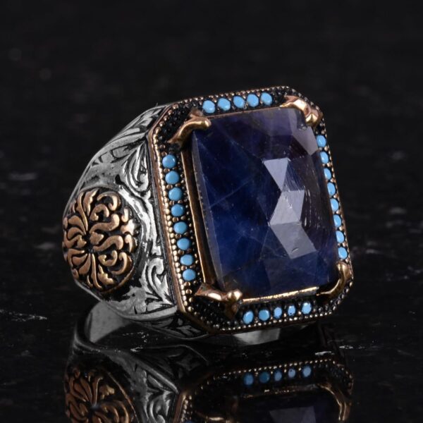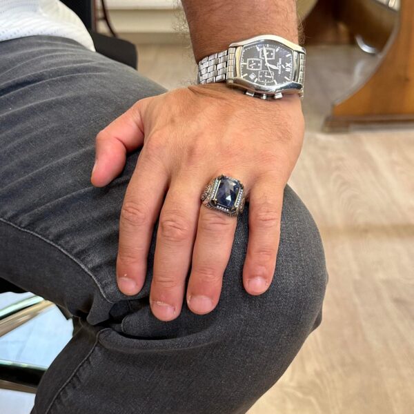 Doğal Safir Taşlı Yüzük, Dikdörtgen Tasarım – 925 Ayar Gümüş Erkek Yüzüğü, El Yapımı Şıklık