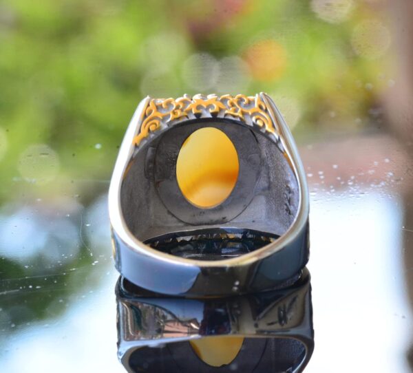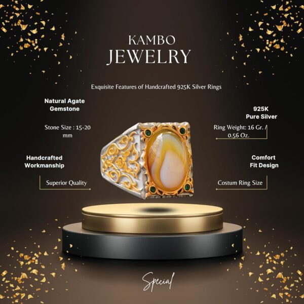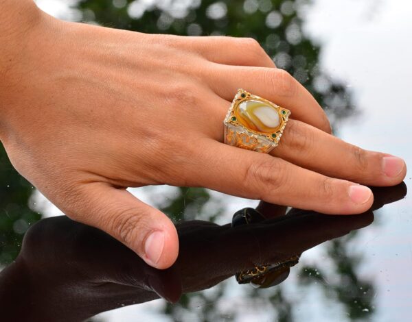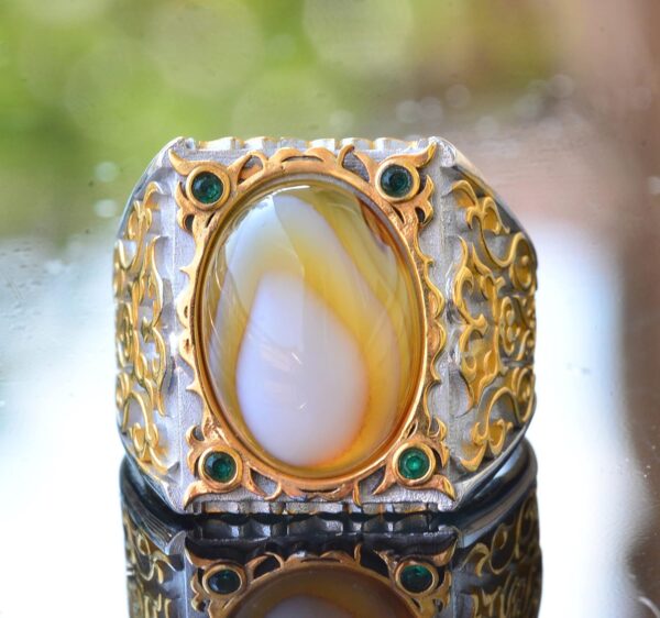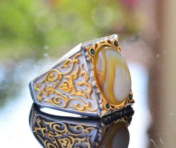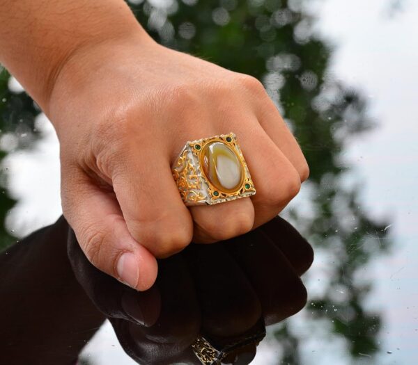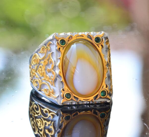 El Yapımı İşçilik: Her yüzük titizlikle el yapımıdır, böylece her parçada benzersiz detaylar ve olağanüstü kalite sağlanır. İşçilik, akik taşının karmaşık tasarımını ve doğal güzelliğini vurgular.