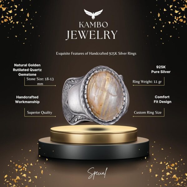 KAMBO Özel Koleksiyonu, 925K Solid Sterling Gümüş Erkek Yüzüklerimizin eşsiz zarafetini keşfetmeye davet ediyor. Her biri farklı doğal taşlarla zenginleştirilmiş olan bu yüzükler, kendine has güzellikleri ve sundukları enerji ile seçilmiştir. El yapımı yüzüklerimiz, ince işçiliğin bir kanıtı olarak lüksün ve kişisel ifadenin özünü yansıtır. KAMBO, yüzüğünüzü tam boyutunuza ve tercihlerinize göre özelleştirme seçeneği sunarak, sizi kaliteli takı dünyasına samimi bir yolculuğa çıkarır. Doğanın ve sanatın uyumunu deneyimleyin; her biri kalite, tatmin ve zamansız zarafet vaadi taşıyan olağanüstü taş yüzüklerimizle. Yüzük Ağırlığı: 11gr Taş Boyutu: 18-13mm