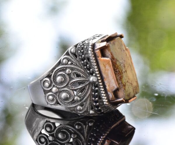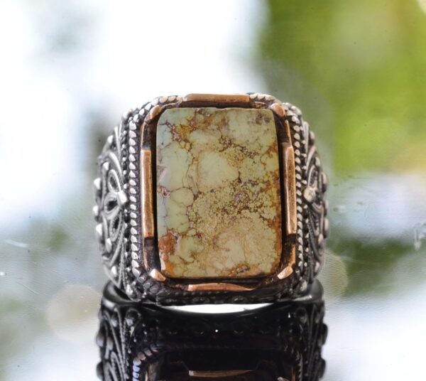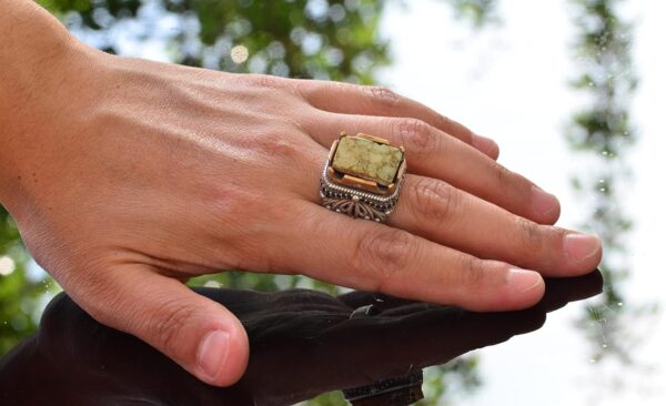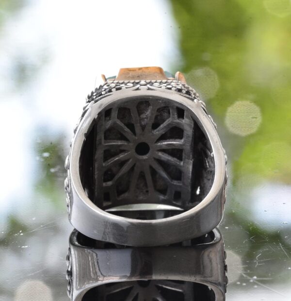 Yüzük, barış, güç ve iyi şansı temsil eden çarpıcı bir açık mavi taş sergilemektedir. Bu tasarım unsuru, yüzüğün görsel çekiciliğini artırmakla kalmaz, aynı zamanda değerli taşla ilişkilendirilen olumlu özelliklerin sürekli hatırlatıcısı olur.