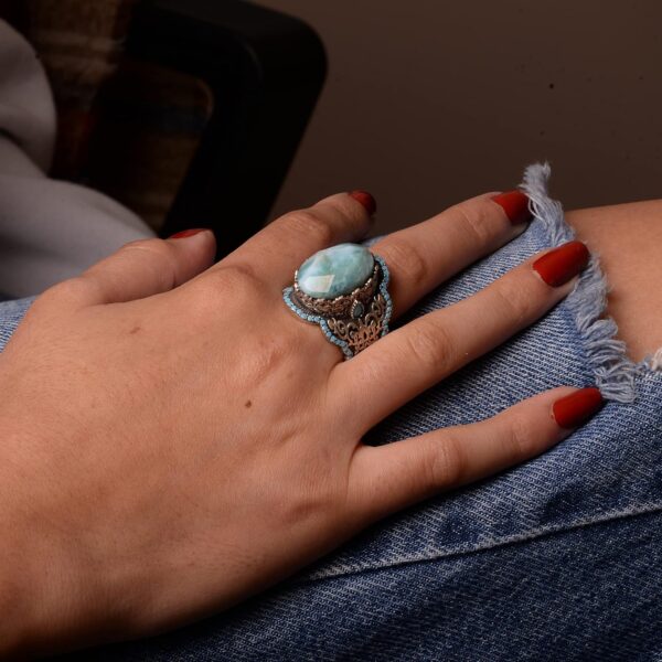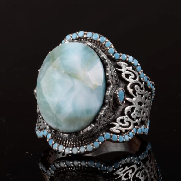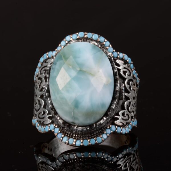 - ZARİF TASARIM: İçinde etkileyici doğal Larimar taşı bulunan, detaylı bir tasarıma sahip muhteşem bir yüzük.