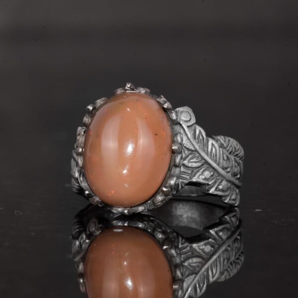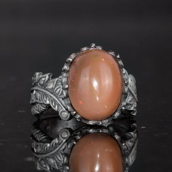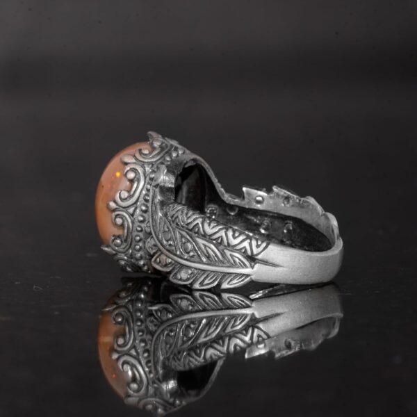 El Yapımı 925 Ayar Gümüş Erkek Yüzük Doğal Opal Taşı – Yaprak Desenli İfadeli Yüzük