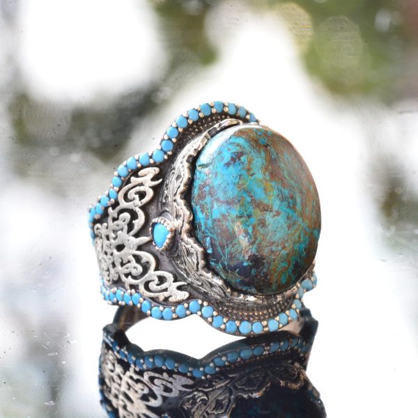 Yüzüğün tasarımı, geleneksel Orta Doğu motiflerinden ilham alarak, kültürel önemini vurgulayan karmaşık desenler ve turkuaz detaylar içermektedir. Bu taşın şifa özellikleri ile kültürel sanatı birleştiren bu yüzük, anlamlı ve şık bir aksesuar haline gelmektedir.