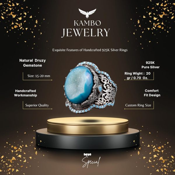 Bu muhteşem yüzük, ince zanaatkarlığın ve kültürel mirasın bir kanıtıdır. Yüksek kaliteli 925 ayar gümüşten el yapımı olarak üretilmiştir ve etkileyici bir doğal Drusy Kuvars taşı ile süslenmiştir. Parlak yüzeyi ve yatıştırıcı özellikleri ile bilinen Drusy Kuvars, zihinsel netlik ve denge sağlamaya yardımcı olduğuna inanılır; bu nedenle iç huzur ve odak arayanlar için mükemmel bir taş olarak kabul edilir.