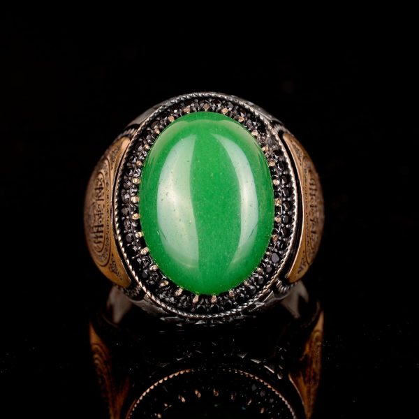 El Yapımı 925 Ayar Gümüş Erkek Yüzük Doğal Yeşil Jade Taşı – İslami Tasarım