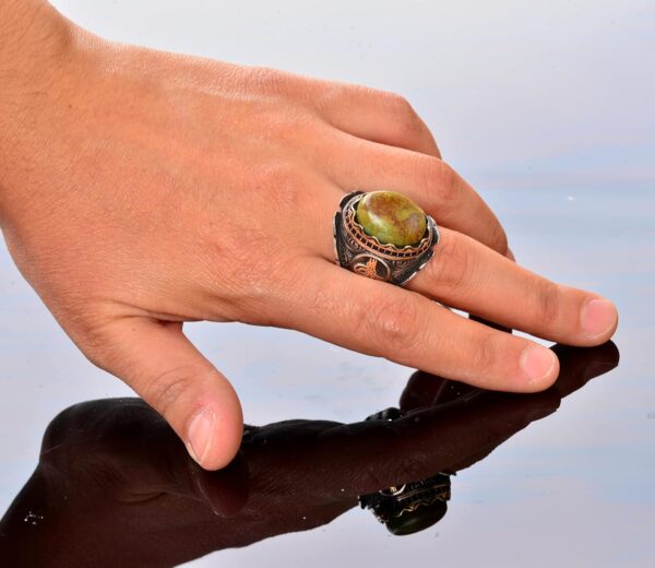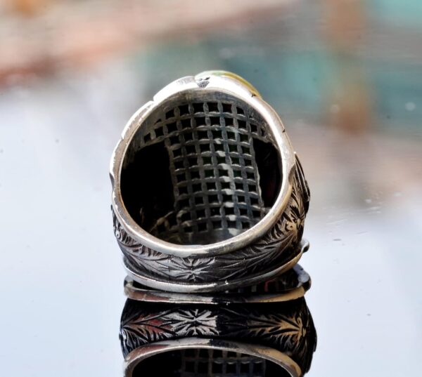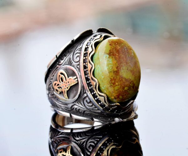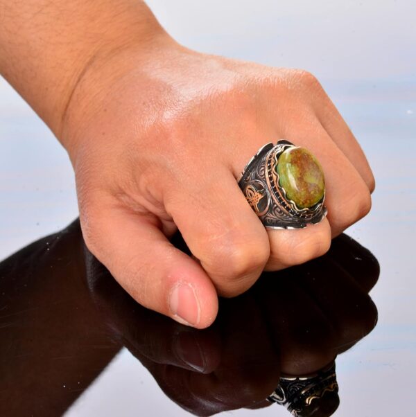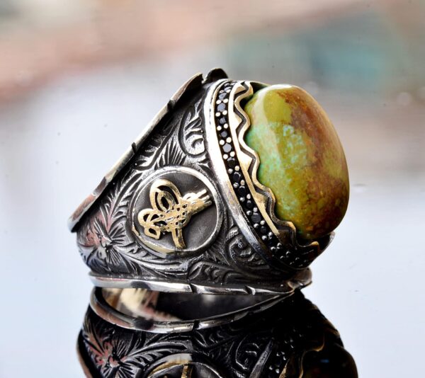 Özgün El Yapımı Tasarım: Bu erkek yüzüğü titizlikle el yapımıdır ve olağanüstü sanatçılığı sergileyen karmaşık bir Osmanlı Sembolü tasarımına sahiptir. Yüksek kaliteli 925 ayar gümüşten yapılmış olup, kalıcı güzellik ve dayanıklılık vaadinde bulunmaktadır.