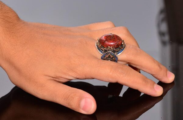 Özenle El Yapımı Tasarım: Bu erkek yüzüğü, olağanüstü sanatkarlığı sergileyen, gerçek bir Kan Taşı (Bloodstone) taşına sahip, karmaşık bir aslan tasarımı ile titizlikle el yapımıdır. Yüksek kaliteli 925 ayar gümüşten üretilmiş ve ek lüks için altın kaplama ile tamamlanmıştır, bu da kalıcı bir güzellik ve dayanıklılık vaat eder.