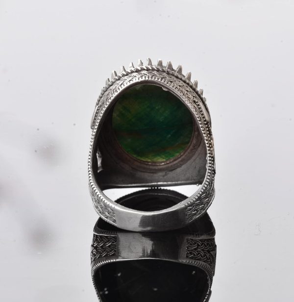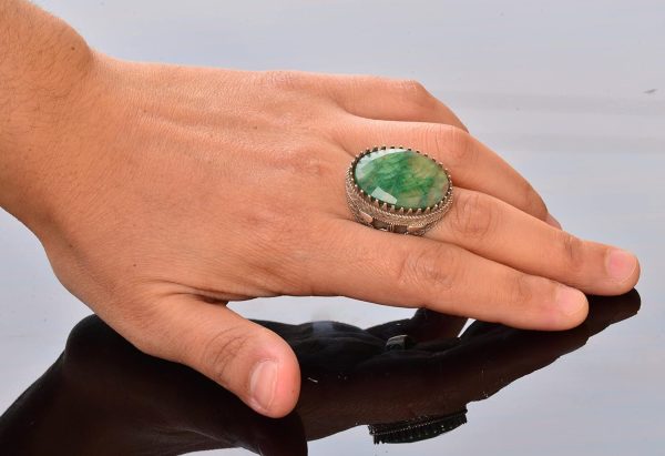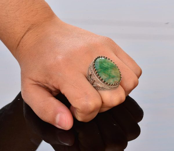El Yapımı 925 Ayar Gümüş Erkek Yüzük – Gerçek Zümrüt Taşı – Karmaşık Osmanlı Tasarımı – İmza Yüzük