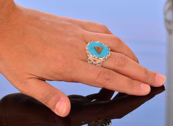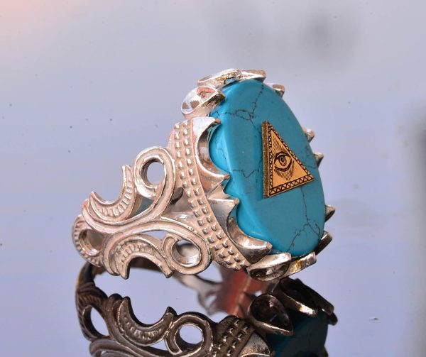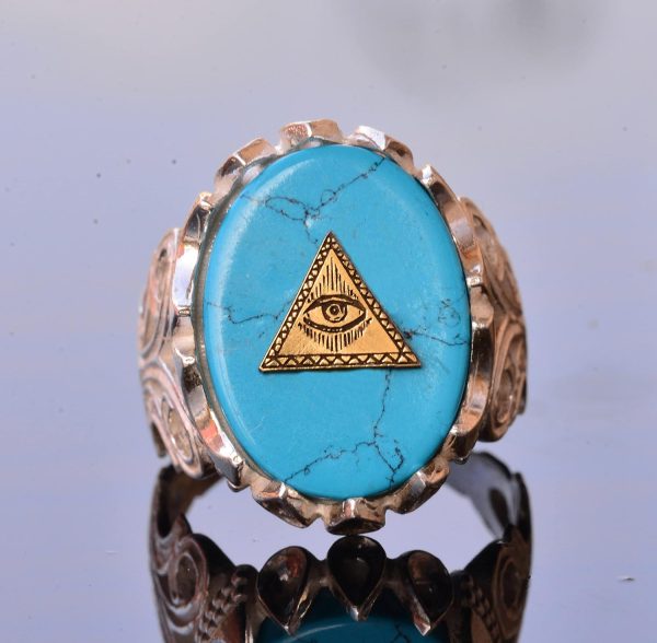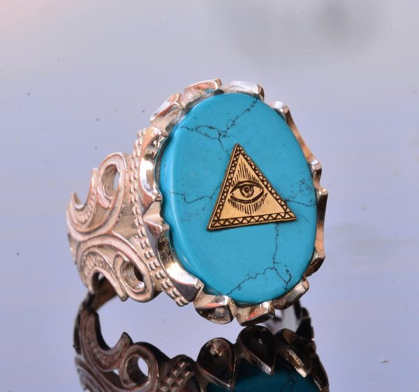 El Yapımı 925 Ayar Gümüş Erkek Yüzük, Gizemli Ezoterik Sembol, Turkuaz Taşı, Ayrıntılı Sinyet Tasarımı, Tılsım Yüzük (Kötü Göz Piramidi)
