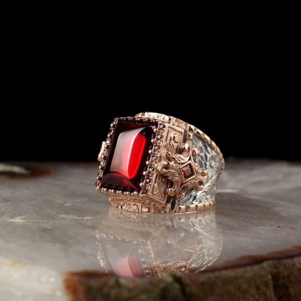 Özenle El Yapımı Tasarım: Bu erkek yüzüğü titizlikle el yapımıdır, muhteşem bir kırmızı zirkon taşı ile birlikte karmaşık bir vintage tasarıma sahiptir ve olağanüstü bir sanat eserini sergilemektedir. Yüksek kaliteli 925 ayar gümüşten ve rodaj kaplamalı olarak üretilmiştir, kalıcı güzellik ve dayanıklılık vaat etmektedir.