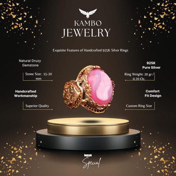 KAMBO Gerçek Doğal Druzy Kristal Kuvars Taşı Erkek Yüzük Koleksiyonu’nu tanıtıyoruz. Titiz bir detay hassasiyetiyle el yapımı olarak üretilen bu 925 ayar gümüş yüzükler, Pembe, Yeşil ve Lacivert renkteki Druzy Kuvars’ın doğal cazibesini sergiliyor. Her bir taş, doğal güzelliği ve ışıltılı dokusuyla seçilmiştir ve şık olduğu kadar cesur bir görünüm sunar. Bu yüzüklerin el yapımı olma özelliği, her parçanın, onu takan birey kadar eşsiz olmasını sağlar ve KAMBO’nun olağanüstü kalite ve zamansız stil konusundaki taahhüdünü yansıtır. Doğanın muhteşemliğini, zanaatkar işçiliği ile birleştiren bir parça ile takı koleksiyonunuzu zenginleştirin.