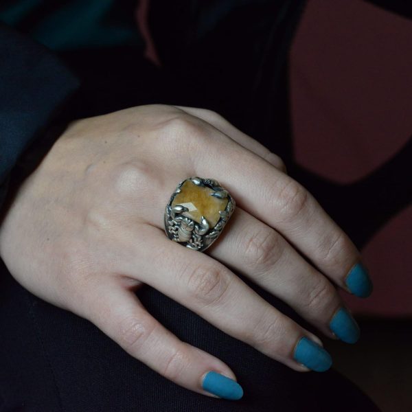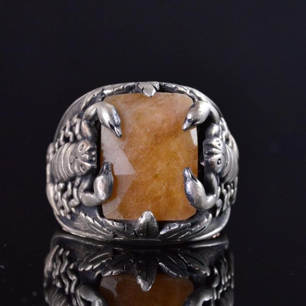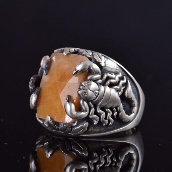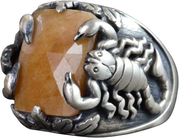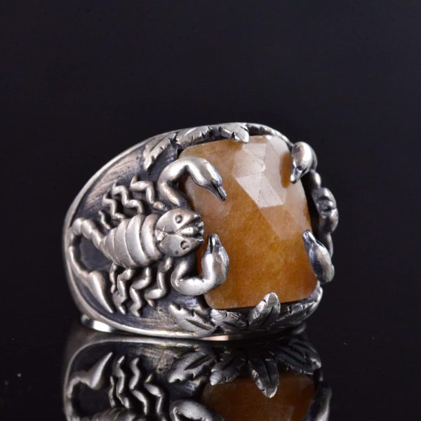 El Yapımı 925 Ayar Gümüş Yüzük, Gerçek Doğal Sarı Safir Taşı ve Akrep Tasarımı – Erkekler İçin Takı