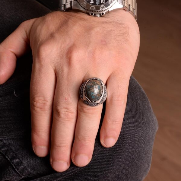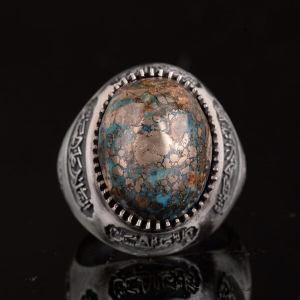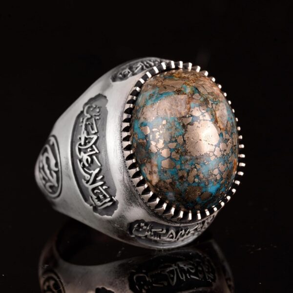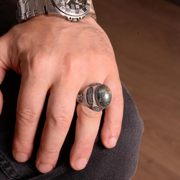 El Yapımı 925 Ayar Gümüş Yüzük, Gerçek Doğal Turkuaz Taşı ve İslami Hat ile – Erkek Takısı