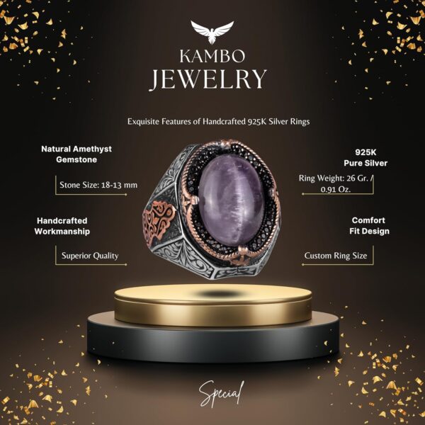 KAMBO El Yapımı Ametist Taş Yüzük – Spiritüel 925K Katı Gümüş Erkek Yüzüğü, Sezgi ve Koruma Tasarımı
