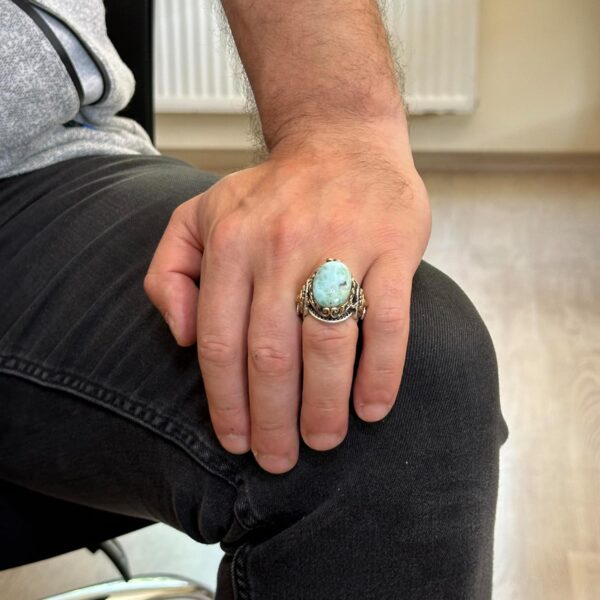 Bu muhteşem erkek yüzüğü, sakinleştirici ve dengeleyici özellikleri ile bilinen etkileyici bir Larimar taşına sahiptir. Bu taş, burçlar arasında Aslan ile ilişkilendirilir ve duygusal huzur ve içsel dinginlik sağladığına inanılır.