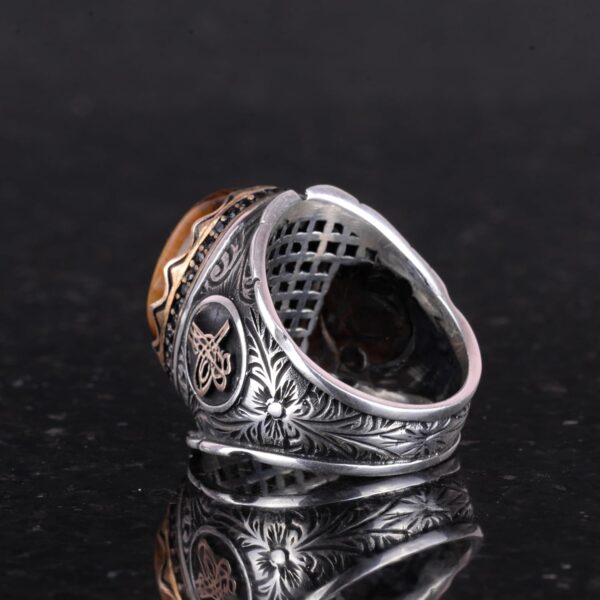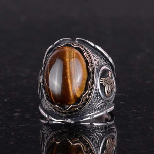 El Yapımı Cabochon Kaplan Gözlü Taş Yüzük, 925K Katı Gümüş Erkek Yüzüğü, Cesur Tasarım, Osmanlı Tuğra Yüzüğü