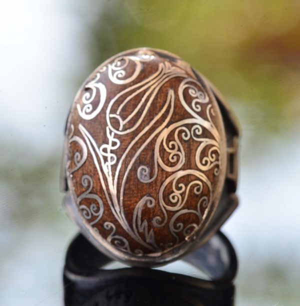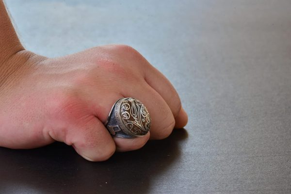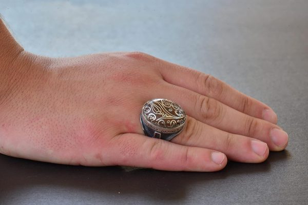 El Yapımı Ceviz Oymalı Gümüş Taş İşlemeli – Ayar Gümüş Erkek Yüzük