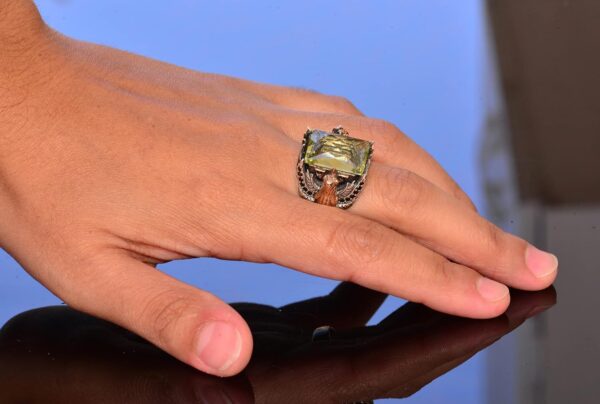 Bu el yapımı yüzük yalnızca bir takı parçası değil; zanaatkarlığın, güzelliğin ve oluşturulmuş taşların mistik özelliklerinin ve güçlü sembollerin bir simgesidir.