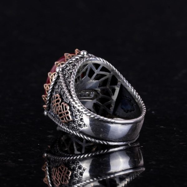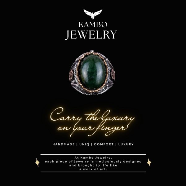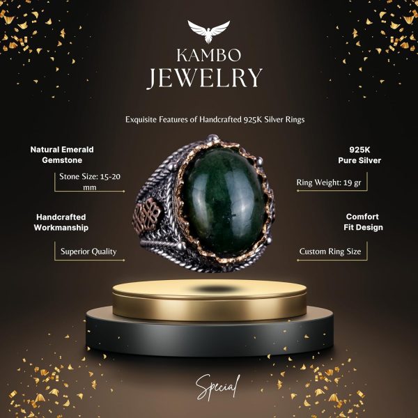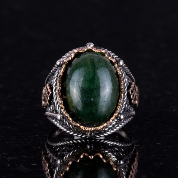 El Yapımı Doğal Cabochon Zümrüt Taşlı Yüzük, 925 Ayar Katı Gümüş Erkek Yüzük