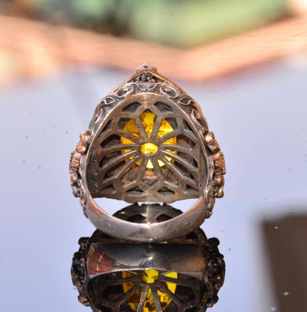 Bu el yapımı yüzük, 925 Ayar Gümüşten yapılmıştır ve zengin altın rengi ve sıcak, parlayan görünümü ile bilinen güzel bir Bal Amber taşı ile süslenmiştir. Yüzüğün tasarımı, zamansız ve antik motiflerden ilham alınarak özenle detaylandırılmıştır ve herhangi bir takı koleksiyonunda dikkat çekici bir parça olmasını sağlamaktadır.