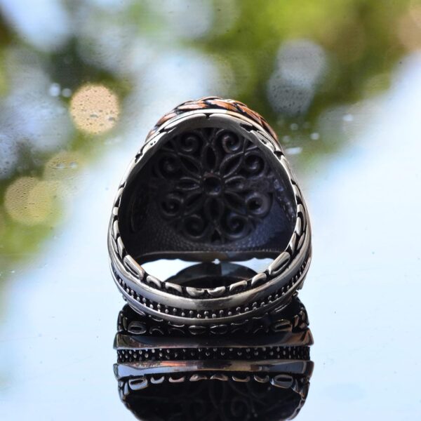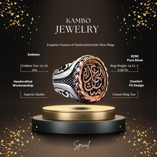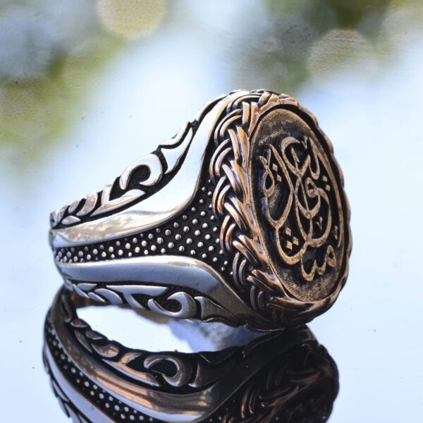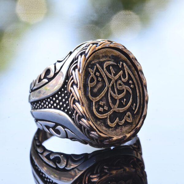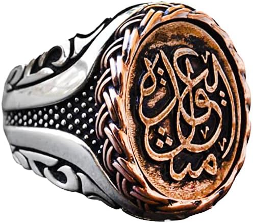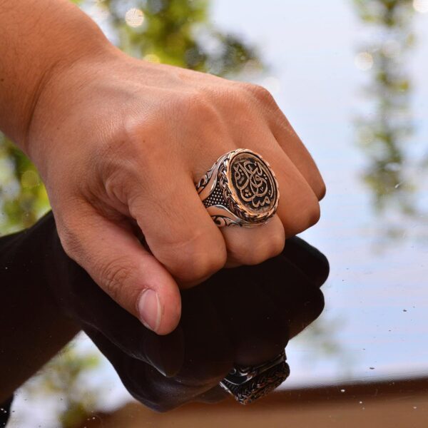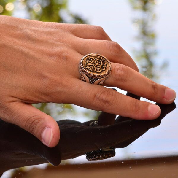 Ruhsal Anlam: Bu yüzük, hem gündelik hem de resmi giyimde mükemmel bir uyum sağlar, her kıyafete sofistike bir dokunuş ve ruhsal anlam katar. Gümüş ve bronz inlay ile Arap hatlarının klasik kombinasyonu, her durum için çok yönlü bir aksesuar olmasını sağlar.