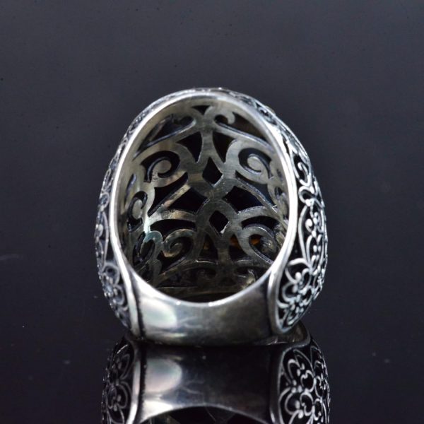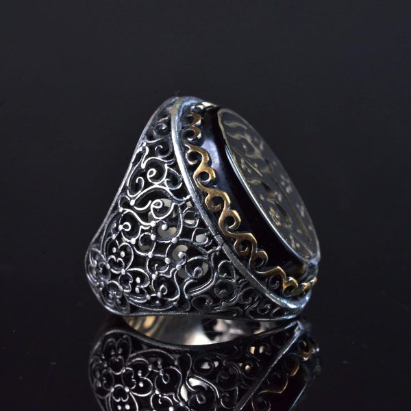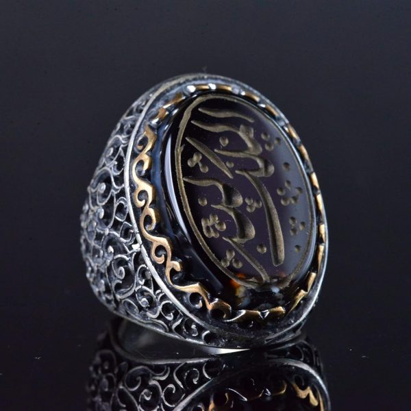 İSLAMİ HAT SANATI TASARIMI: Yüzük, tasarımına kültürel bir anlam ve ruhsal derinlik katan ince işçilikle yazılmış İslami hat sanatı ile süslenmiştir. Bu karmaşık sanat eseri, yüzüğü sadece güzel bir aksesuar değil, aynı zamanda inancınızı ve mirasınızı yansıtan anlamlı bir parça haline getirir.