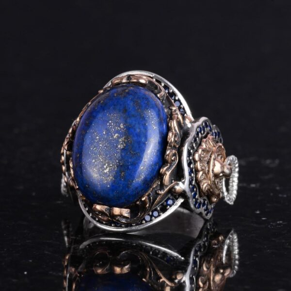 KAMBO El Yapımı Lapis Lazuli Taş Yüzüğü ile kraliyet zarafetini keşfedin; aslan kafası tasarımı ve 925K Katı Gümüş ile işlenmiştir.