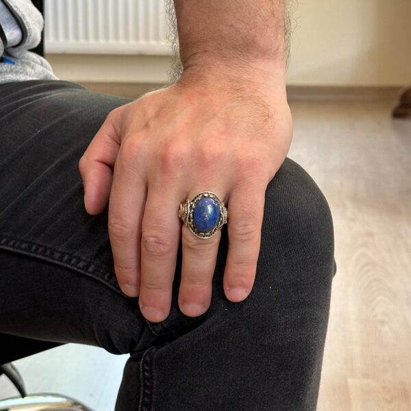 Bu muhteşem erkek yüzüğü, bilgelik artırıcı ve gerçekleri ortaya çıkaran özellikleri ile bilinen etkileyici bir Lapis Lazuli taşı içermektedir. Bu taş, Yay burcu ile ilişkilendirilir ve içgörü ile zihinsel berraklık sağladığına inanılır.