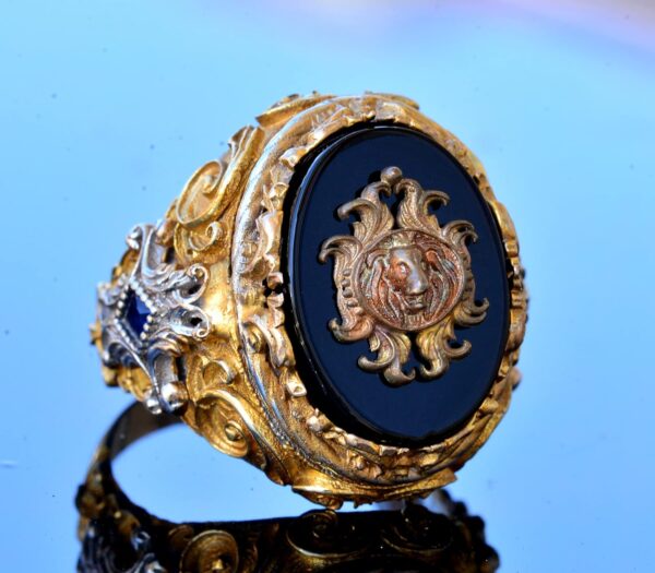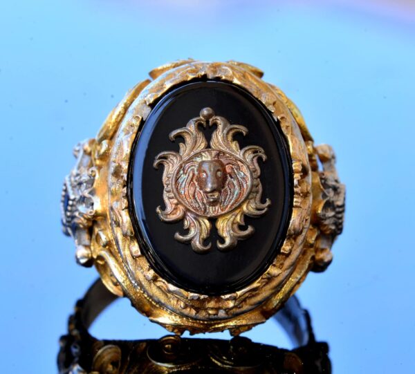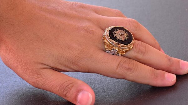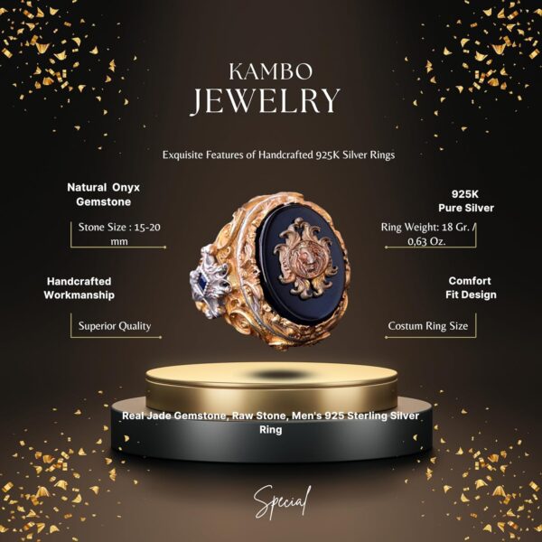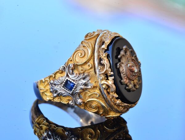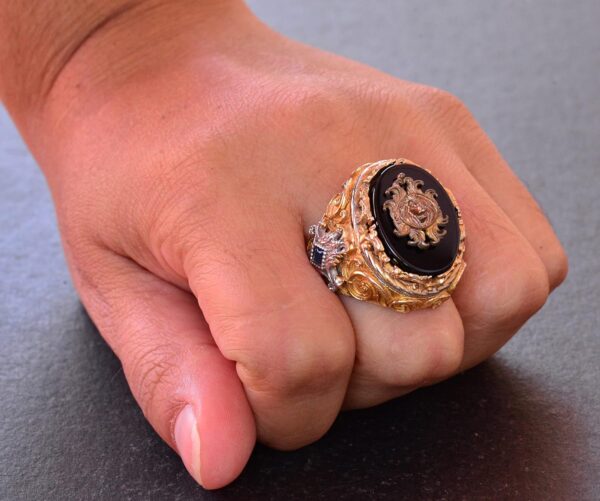 Yüzük, derin siyah onyx taşı ile bezeli olup, karmaşık altın kaplama tasarımına çarpıcı bir zıtlık katarak yüzüğün güçlü ve görkemli estetiğini artırmaktadır. Titizlikle el yapımı olan bu yüzük, sadece bir takı parçası değil; aynı zamanda güç ve liderliğin bir temsilidir.