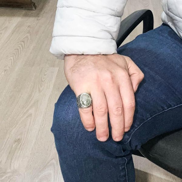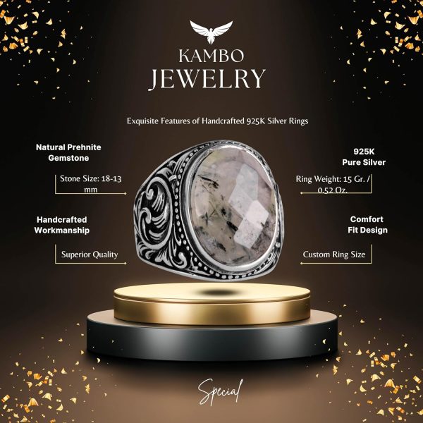 El Yapımı Zarafet: KAMBO, 925K saf gümüş içinde yer alan güzel bir şekilde el yapımı prehnit taş yüzüğü sunuyor. Bu yüzük, özgün ve şık takı parçalarını takdir eden erkekler için tasarlanmıştır.