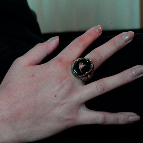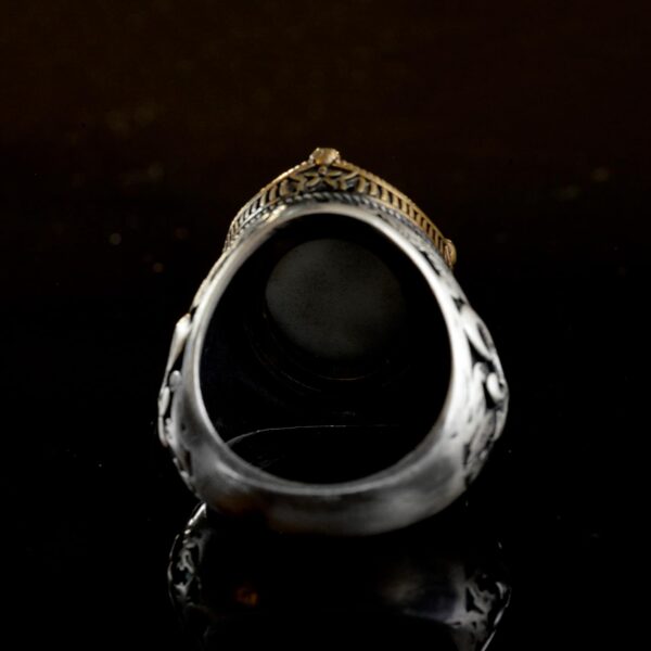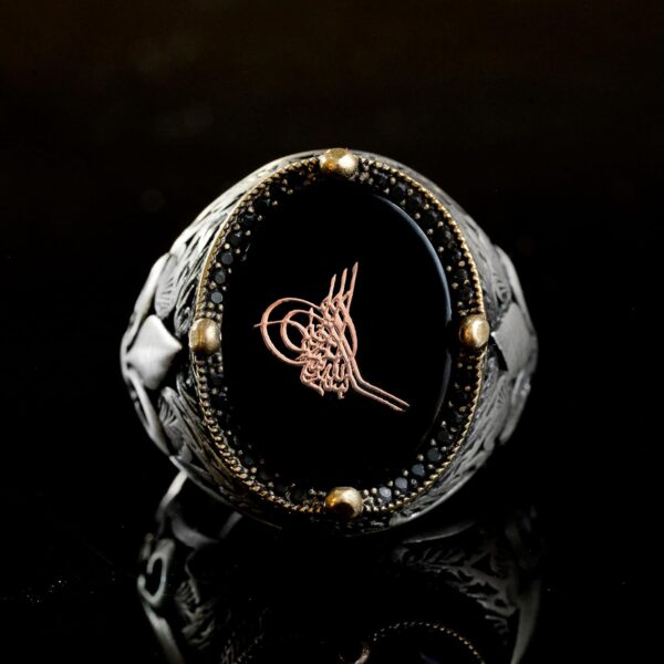 TÜRK TUGHRA TASARIMI: Yüzük, güç ve otoriteyi simgeleyen geleneksel Türk Tughra’sı ile süslenmiştir. Ayrıntılı oymalar, kültürel önemini artırarak anlamlı bir aksesuar haline getirir.