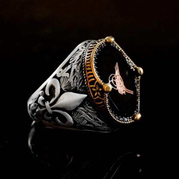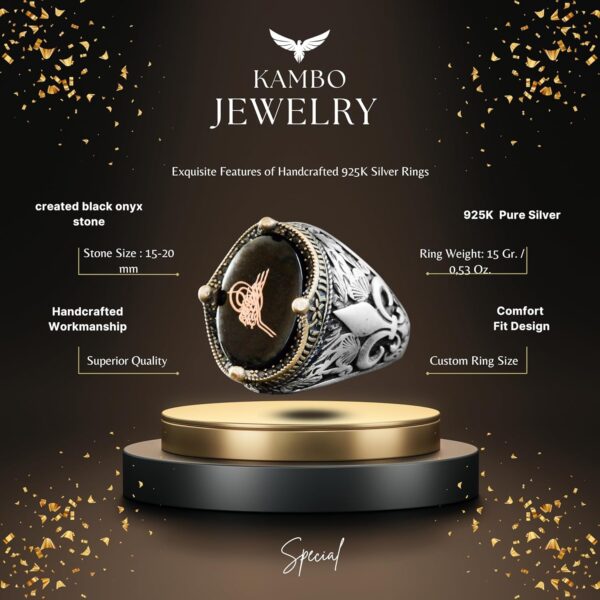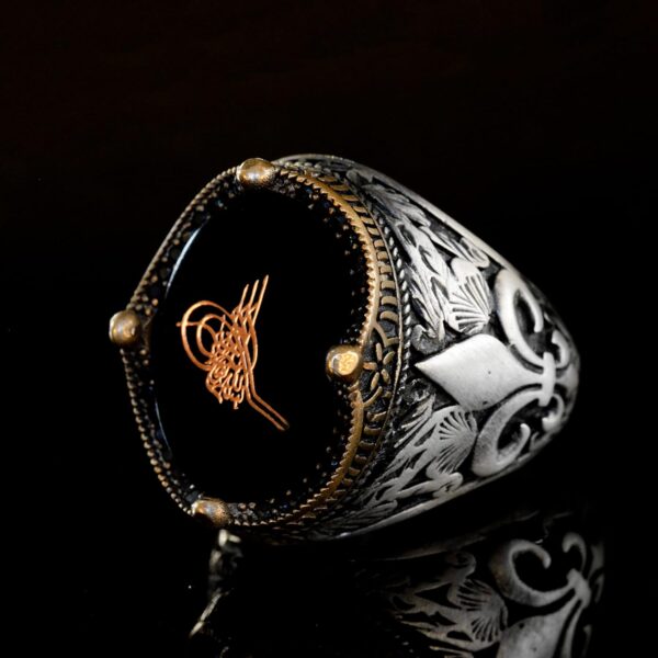 El Yapımı Siyah Oniks Taş Yüzük, 925 Ayar Gümüş Erkek Yüzüğü, Türk Tuğra Tasarımı