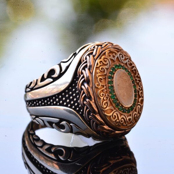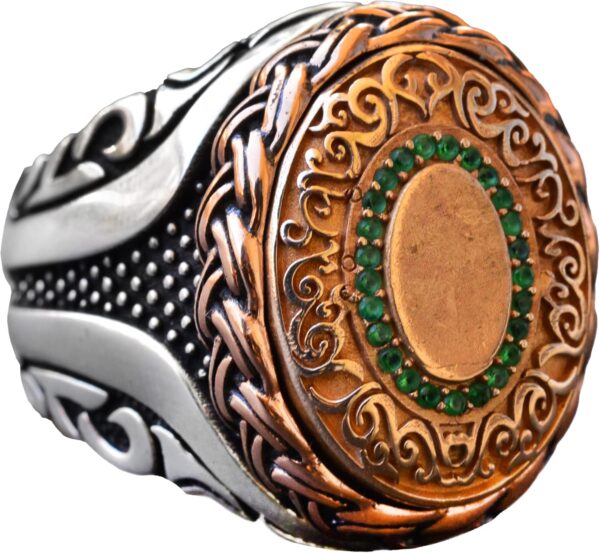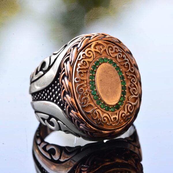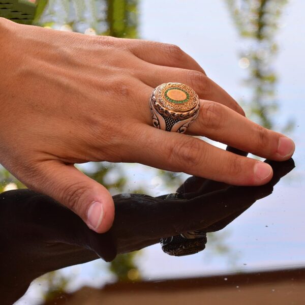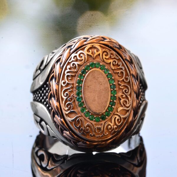 Cesur ve Göz Alıcı: Bu yüzük, hem günlük hem de resmi giyim için mükemmeldir ve her kıyafete sofistike bir dokunuş ekler. Klasik gümüş, bakır ve yeşil taş kombinasyonu, her duruma uygun çok yönlü bir aksesuar olmasını sağlar.