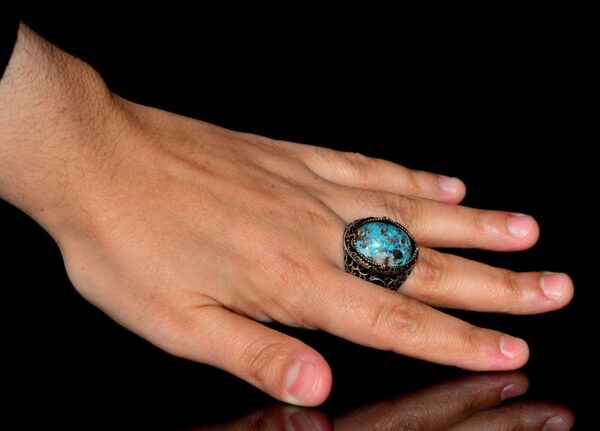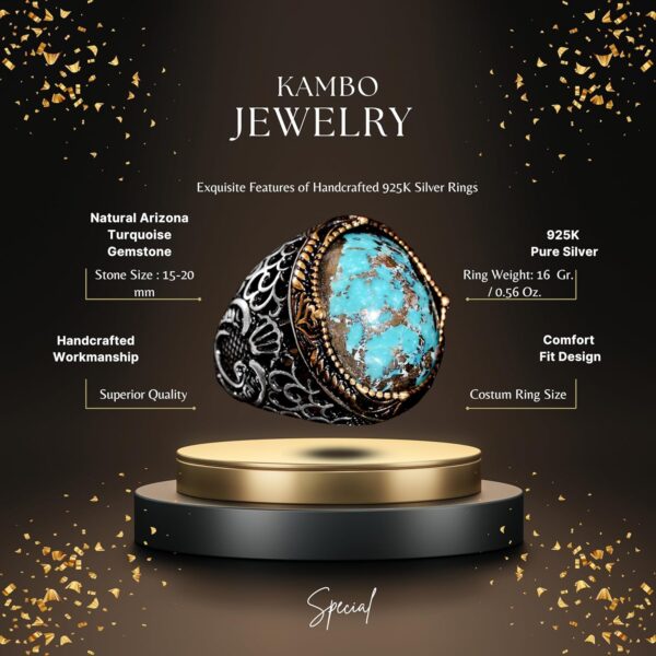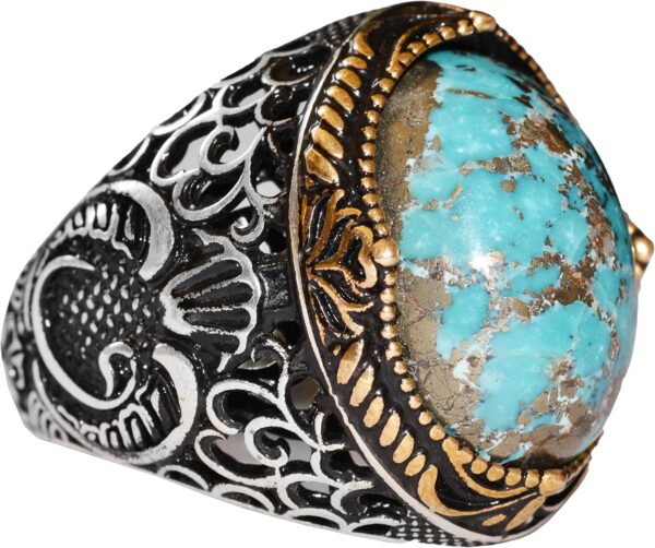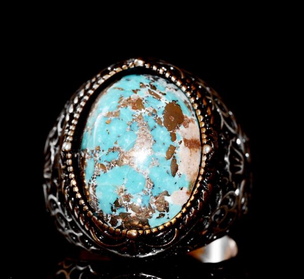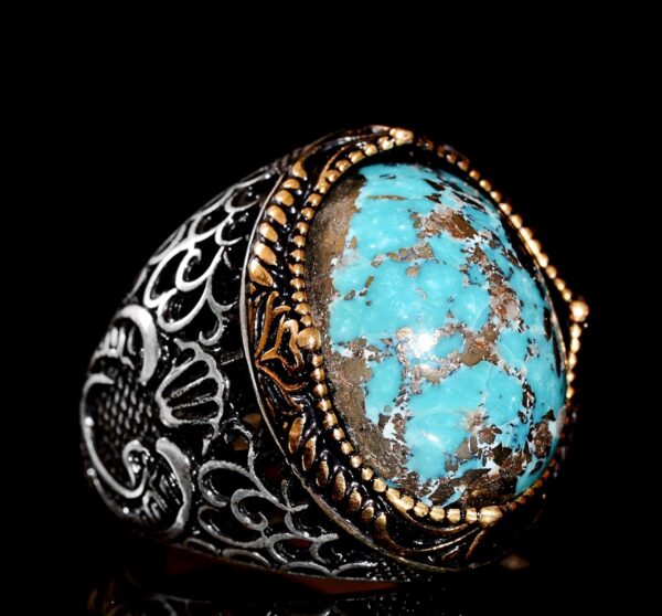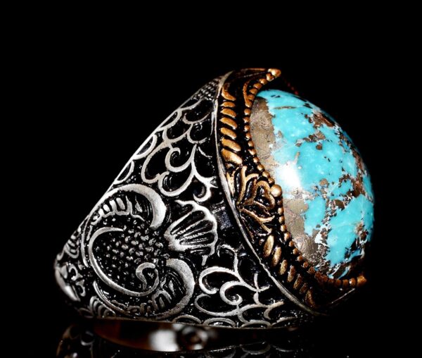Doğal Turkuaz Taşı: Doğal turkuaz taşı, canlı mavi-yeşil rengi ve iyileştirici özellikleri ile tanınır, bu da onu bu cesur yüzüğün mükemmel bir odak noktası haline getirir. Karmaşık tasarımı ve üstün işçiliği, taşın doğal güzelliğini ve gücünü artırır.
