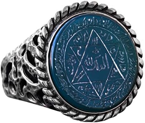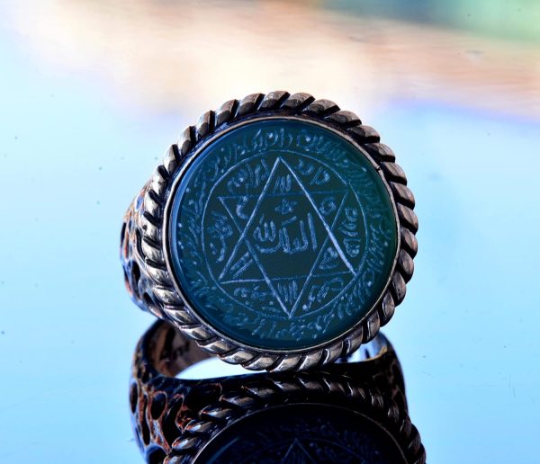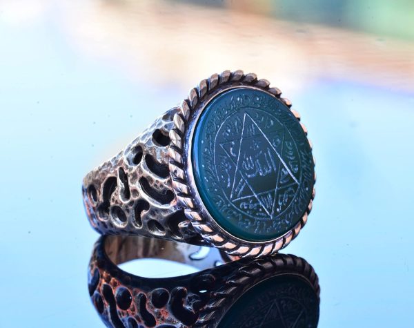 El Yapımı Süleyman Mührü Yüzüğü, Doğal Yeşil Oniks Taşı, İslami Erkek Yüzüğü, 925 Ayar Gümüş