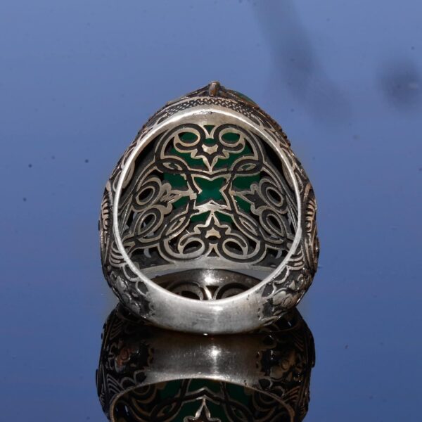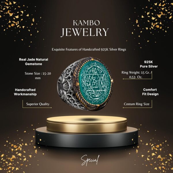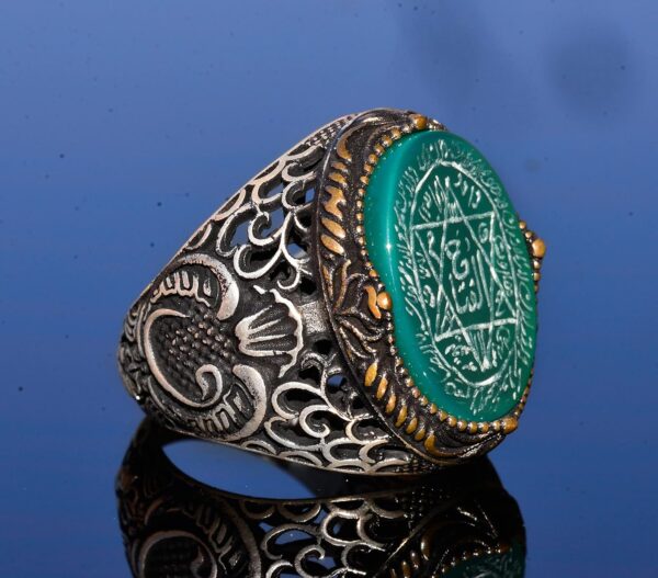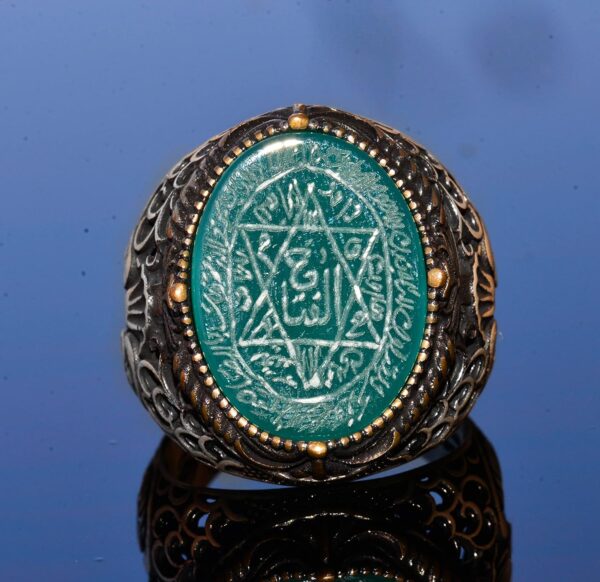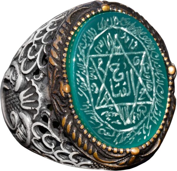 EL YAPIMI SOLOMON MÜHRÜ TASARIMI: Bu muhteşem yüzük, doğal yeşil oniks taşının üzerine el ile işlenmiş karmaşık bir Solomon Mührü tasarımına sahiptir. Ustalık, özveri ve ruhsallığı yansıtarak onu eşsiz bir takı parçası haline getiriyor.