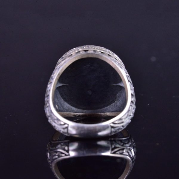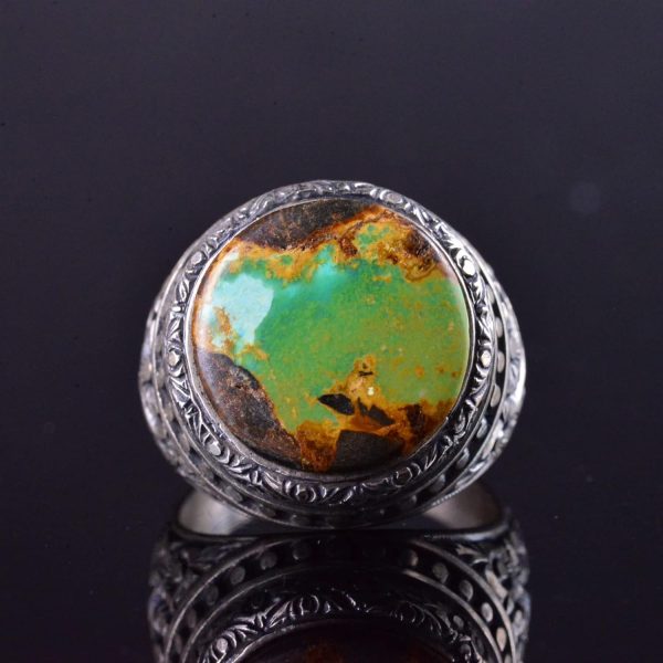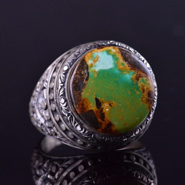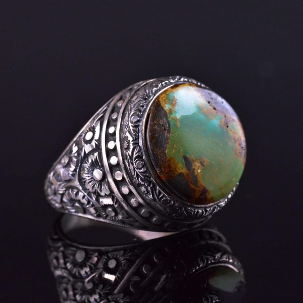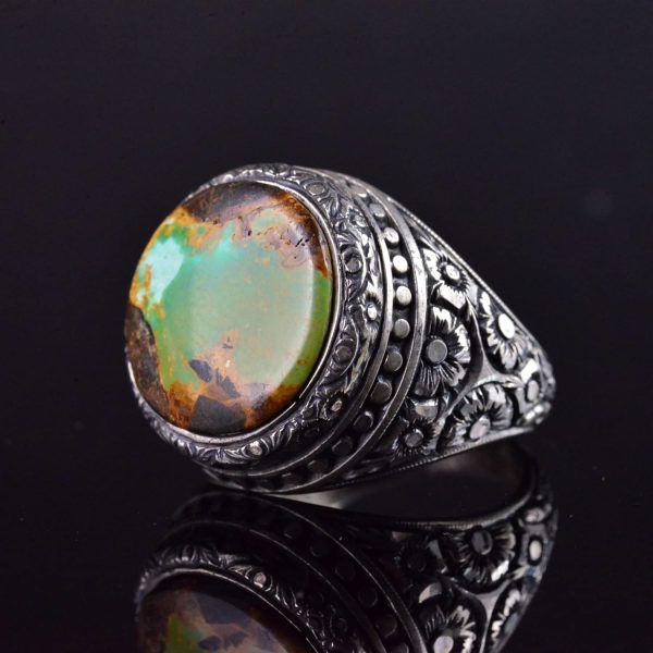 El Yapımı Turkuaz Taş Yüzük, 925 Ayar Gümüş Erkek Yüzüğü, Vintage Çiçek Tasarımı