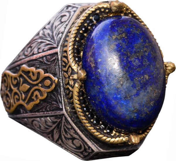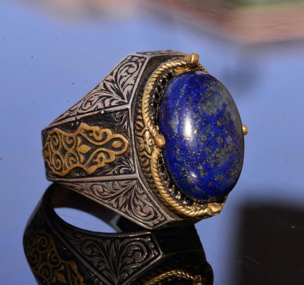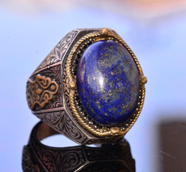 Bu el yapımı yüzük, 925 Ayar Gümüşten üretilmiştir ve derin mavi rengi ile bilinen gerçek Lapis Lazuli taşını içermektedir. Lapis Lazuli, bilgelik ve gerçeğin sembolü olarak da tanınır. Yüzüğün tasarımı, karmaşık vintage tarzı detaylar ve altın vurgularla daha da zenginleştirilmiştir, bu da onu zarafet ve sofistikeliğin simgesi haline getirir.