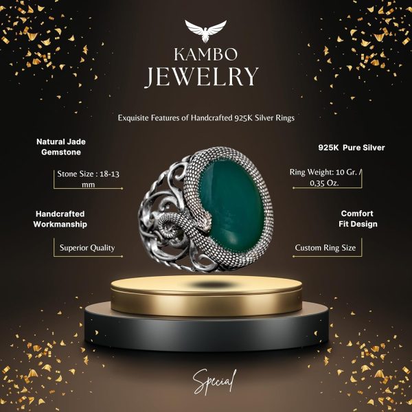 KAMBO El Yapımı Yılan Tasarımı Yüzük, Doğal Yeşim Taşı ile, 925 ayar gümüşün zarafetini, doğal yeşim taşının huzurlu güzelliği ile birleştiren bir şaheserdir. Her bir yüzük, yetenekli zanaatkarlar tarafından titizlikle hazırlanarak, her parçanın benzersiz ve en yüksek kalitede olmasını sağlar.