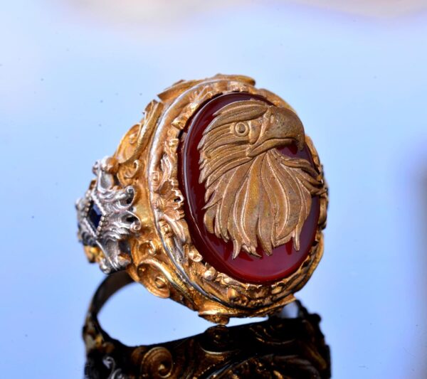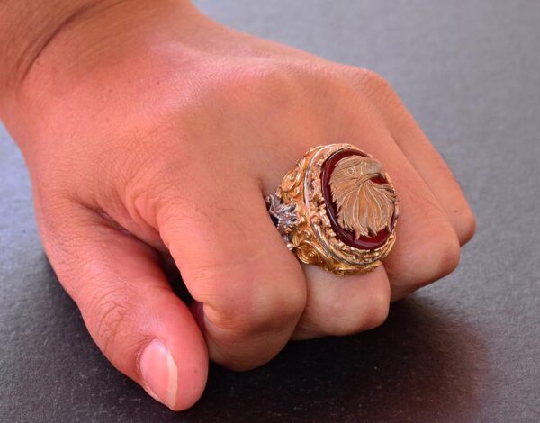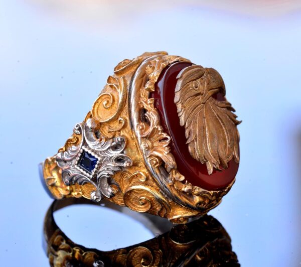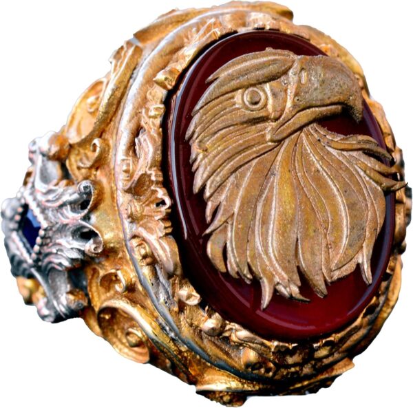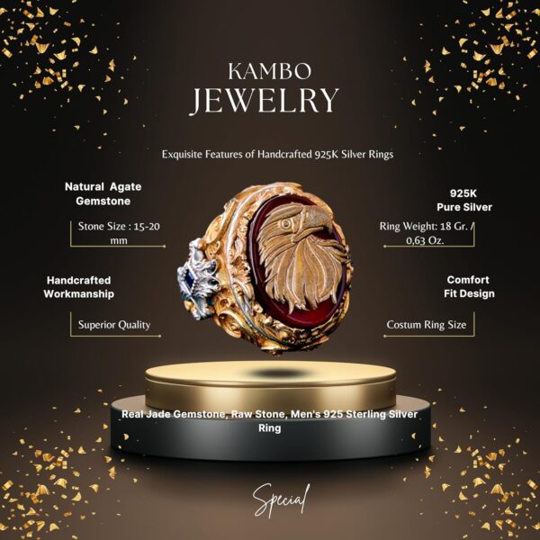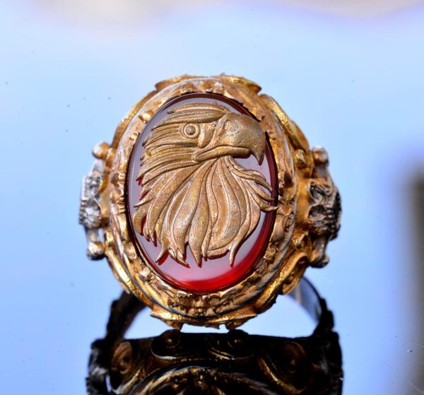 Yüzük, doğal akik taşı ile muhteşem bir şekilde tamamlanan çarpıcı bir kartal başı tasarımına sahiptir. Akik taşı, motivasyon ve koruma özellikleri ile bilinir ve kullanıcıya cesaret ve güven sağlar.