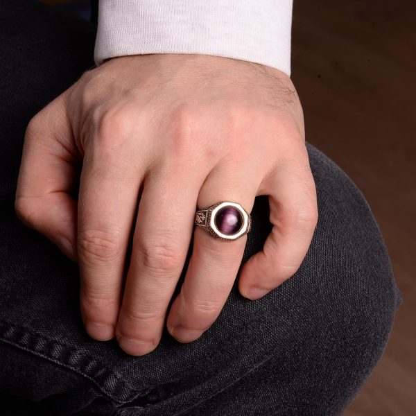 Bu muhteşem erkek yüzük, dayanıklılığı ve şık parlaklığı ile öne çıkan yüksek kaliteli 925 ayar gümüşten yapılmıştır. Yüzük, sakinleştirici özellikleri ve zengin mor rengi ile bilinen etkileyici bir doğal ametist taşına sahiptir, bu da onu her kıyafet için güçlü bir ifade parçası haline getirir.