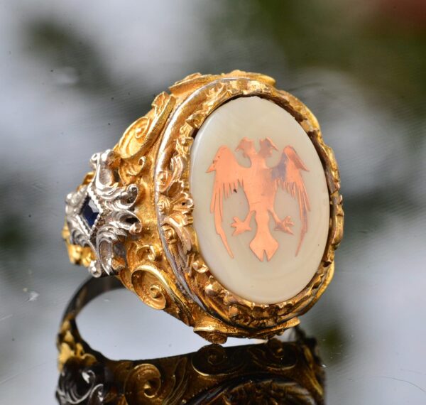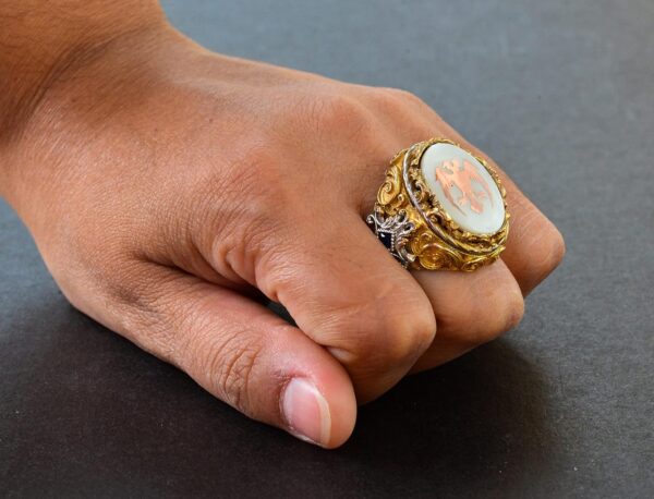 Bu muhteşem erkek yüzük ile stilinizi yükseltin; katmanlı altın kaplama detaylarıyla birlikte titizlikle işlenmiş sağlam 925 ayar gümüşten yapılmıştır. Bu yüzüğün merkezinde, saflığı ve zarafeti simgeleyen güzel bir inci taşı yer almaktadır. Yüzük, güç, otorite ve vizyonu temsil eden görkemli bir çift başlı kartal tasarımına sahiptir. Bu eşsiz tasarım sadece cesur bir ifade oluşturmakla kalmaz, aynı zamanda derin sembolik bir anlam taşır. Tarih meraklıları, sembol severler veya ince takıları takdir eden herkes için ideal olan bu yüzük, anlamlı ve düşünceli bir hediye olarak hizmet eder. Günlük etkinliklerden resmi davetlere kadar çeşitli durumlar için uygun olan bu yüzük, her kıyafete kraliyet zarafeti katmaktadır.
