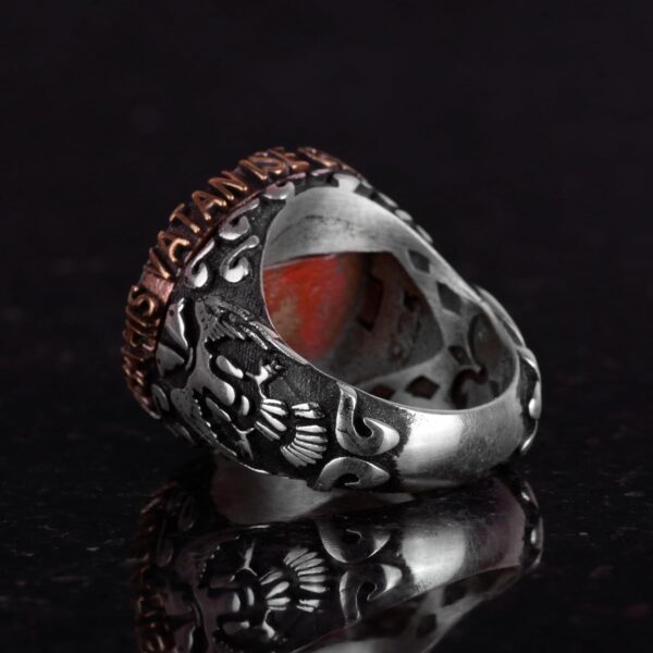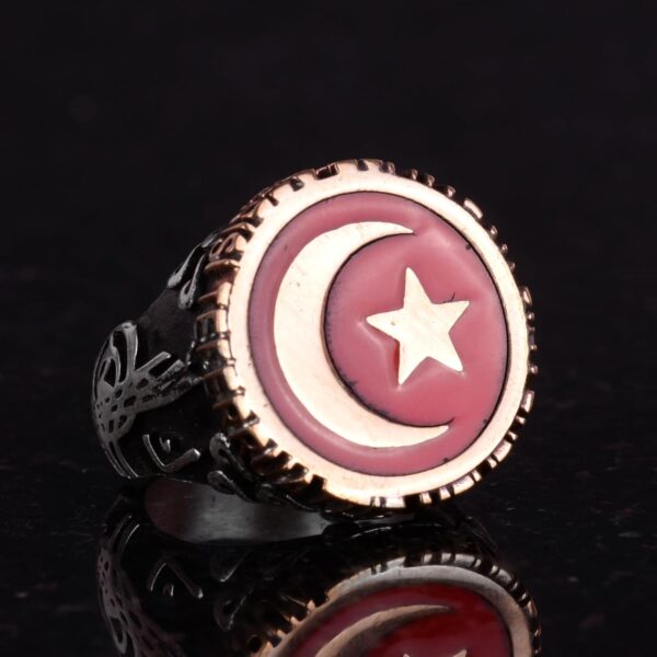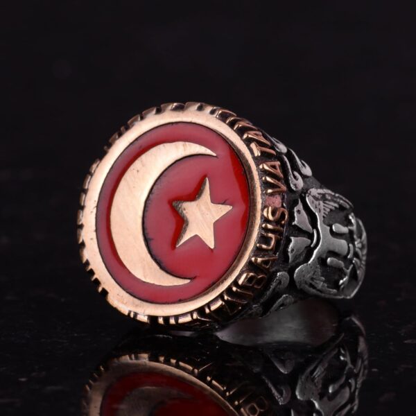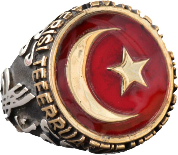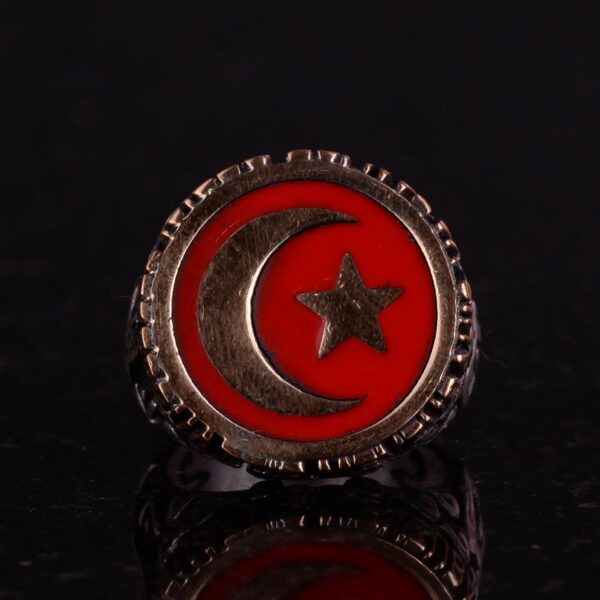 Yüzüğün kırmızı hilal ve yıldız tasarımı, mirası ve inancı simgeler, bu da onu herhangi bir takı koleksiyonuna anlamlı bir ek haline getirir. Detaylı işçiliği, herhangi bir kıyafete şıklık ve kültürel önem katmaktadır.