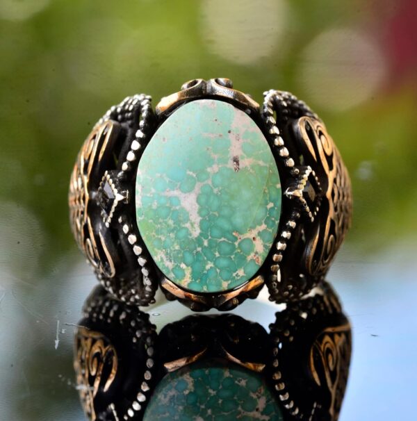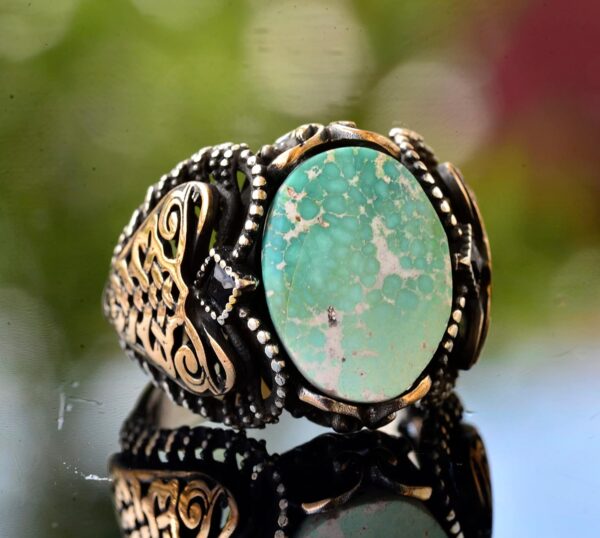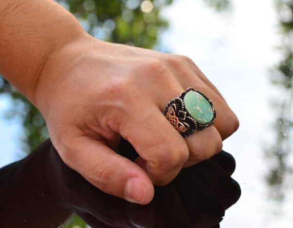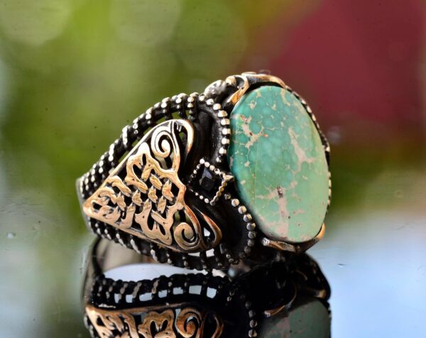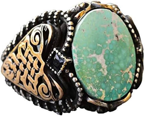 Erkek Yeşil Turkuaz Taş Yüzük, 925 Ayar Gümüş ile Vintage Orta Doğu Tasarımı