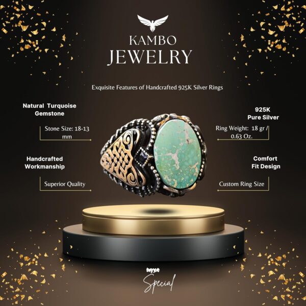 Yeşil turkuazın doğal güzelliği ile 925 ayar gümüşün zarafetini birleştiren çarpıcı bir mücevher parçası olan Erkekler için Yeşil Turkuaz Taş Yüzüğü sunuyoruz. Bu yüzük, eşsiz rengi ve doğal desenleri ile tanınan büyüleyici bir yeşil turkuaz taşı içerir.