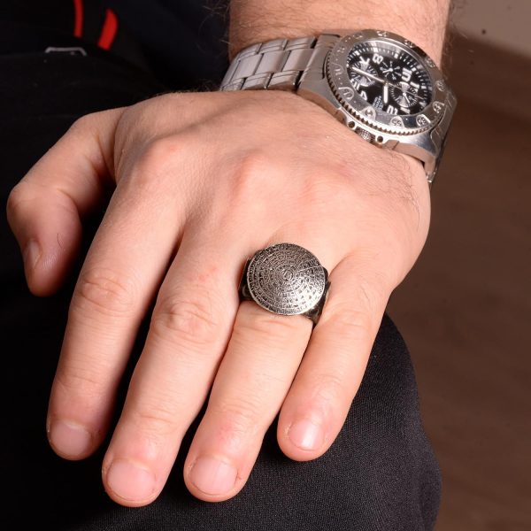 Bu zarif erkek yüzüğü, dayanıklılığı ve sofistike bir parlaklık sunan yüksek kaliteli 925 ayar gümüşten üretilmiştir. Yüzük, 99 Allah İsmi (Esma-ul Hüsna) ile süslenmiştir ve her kıyafet için manevi anlamı olan şık bir aksesuar sağlar.